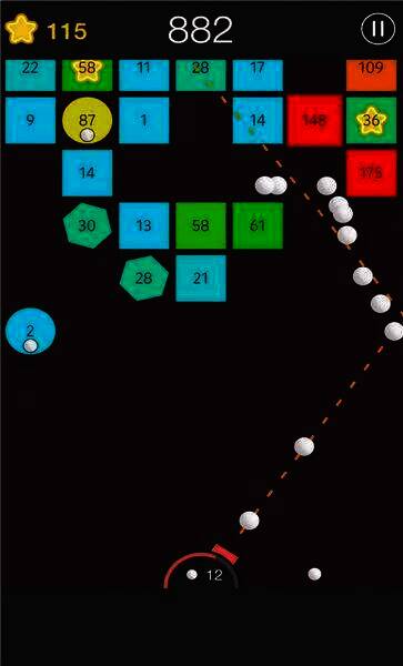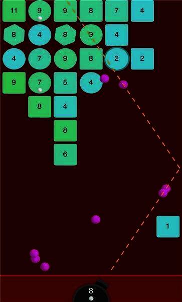 1、玩家触摸或滑动屏幕控制弹球发射角度与力度,精准击中砖块。