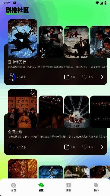 用户打开软件可看到丰富影视作品。影视社区能提供影视信息。软件还有看图猜剧猜演员的趣味玩法,可检测用户影视储备量。