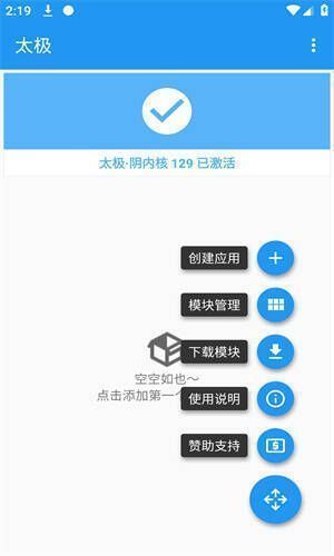1. 打开太极,若显示“太极内核已激活”,则表示可正常使用。点击右下角按钮展开,能看到创建应用、模块管理、下载模块。