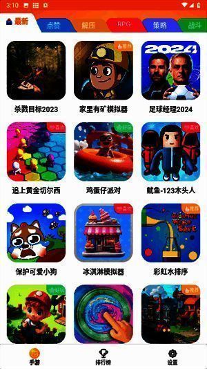 进入游戏平台,首页会推荐各类游戏,如经营类、战斗类、跑酷类等,底栏还有最新火热游戏排行榜,榜单上都是近期受欢迎的游戏。排行榜一栏有本周最热、年度最热以及上头神作,玩家可自由选择。选择游戏后,玩家可以进行下载或收藏。