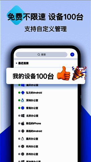 该软件可完美适配五大主流系统进行遥控,手机、平板、电脑等设备能相互遥控。全国200多个区域机房,G级宽带服务器加速,延迟低至0.05秒,24小时稳定在线,文件传输速度达12m/s,如同本地操作般随时开启。