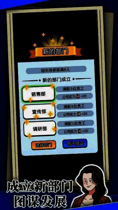 1、公司部门管理:玩家可以调整组织架构,成立新部门,当公司人数达到一定规模时,还可以成立董事会,进一步加强公司实力。
