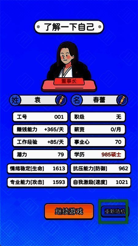 1、进入游戏首先是选择自己的角色身份,每个人物的属性都不一样,可以点击右下角的重新随机更换人物,选择好后点击继续游戏。