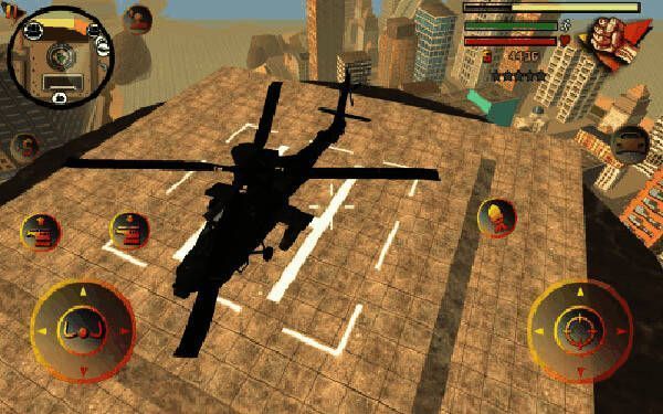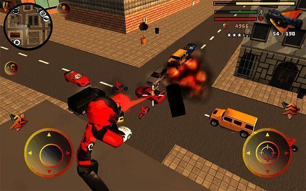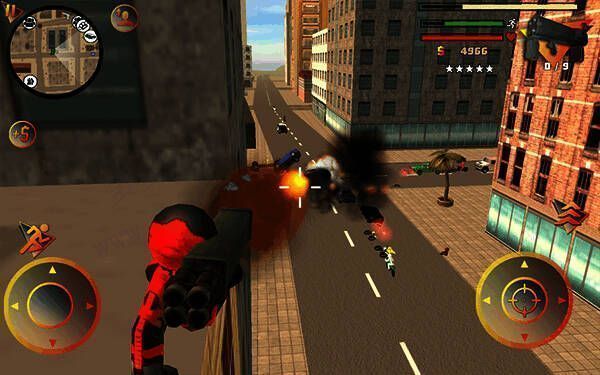 1、基础操作:左侧控制移动、加速,右侧控制绳索、攻击(跳跃)、跳跃,右上侧实时显示武器更换、血量和经验。玩家可自由玩法,与其他帮派人物交火,杀敌获经验,杀多产生星级后会引来巡警等角色进攻,需思考如何存活和击杀敌人。
