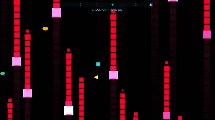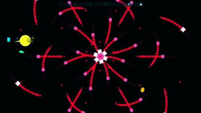 2、极简主义美学与视觉冲击:几何形状、单色高对比度场景和粒子效果相结合,Boss战斗中红蓝菱形冲击波与音乐Drop片段同时爆发,增强视听沉浸感。
