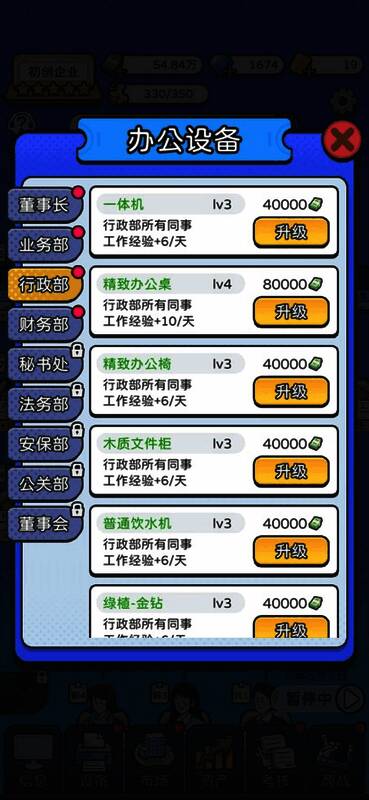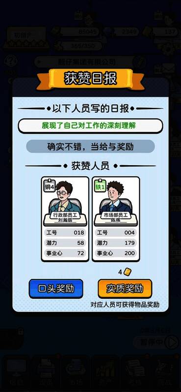 最新v5.2版本带来了多项新增功能,包括“晋升”机制、“公司福利”体系、“员工创业”模式等,同时还加入了时间加速功能,帮助玩家更快推进公司发展。此外,“人才推荐”系统也新增了随机招聘事件,进一步丰富了游戏内容与互动性。
