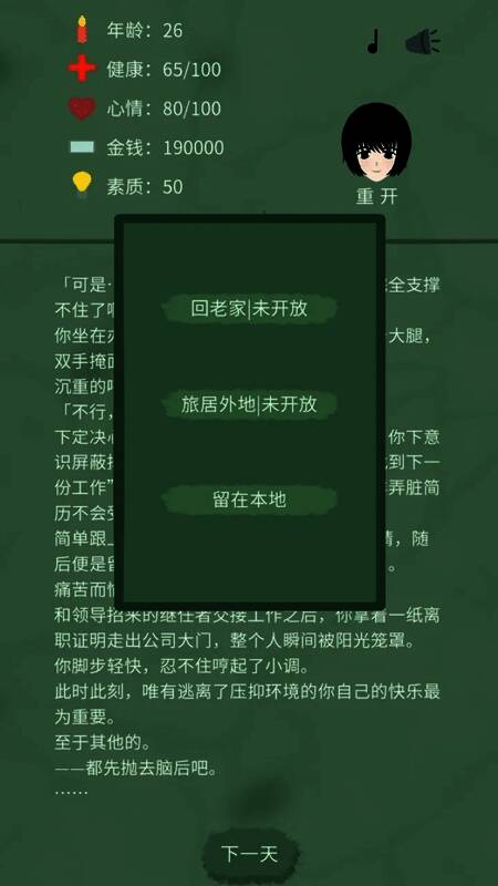 这是以裸辞后人生为主题的文字人生模拟游戏。玩家扮演失业者,能感受来自家庭和朋友的关怀,明白生活中有比工作更重要的东西。游戏有两条不同剧情线,玩家可按需选择发展路径,体验不一样的故事和结局。快来开启这场独特冒险,探索精彩人生!