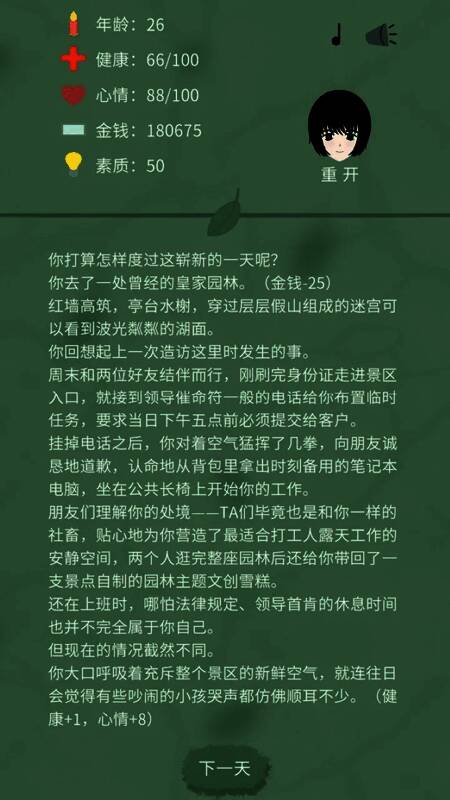 2. 系统给出个人背景信息,如存款、技能、社交关系等,玩家合理评估现状,制定发展策略。