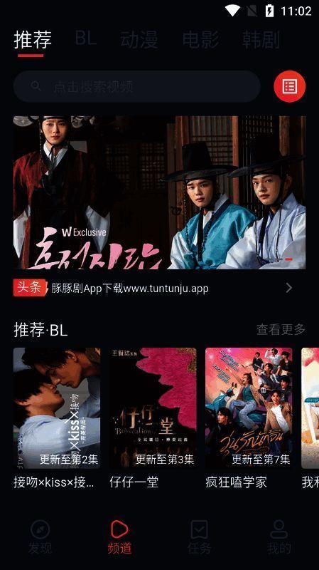 1、在“频道”页面搜索框搜索想看的剧、电影、综艺。