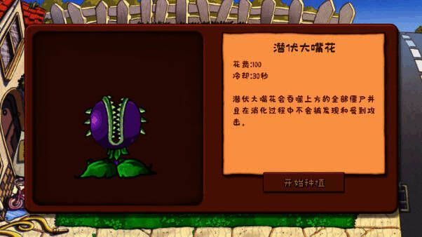 3、开局会详细展示植物属性,如潜伏大嘴花,花费100,冷却30秒,它会吞噬上方全部僵尸,消化时不被发现和攻击。