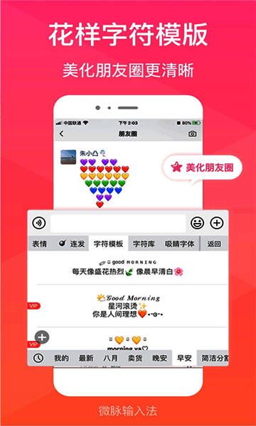 微脉输入法手机版是一款非常实用的输入法软件,深受用户喜爱,还为用户提供超多优质键盘皮肤。喜欢就快来免费下载吧!