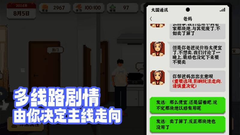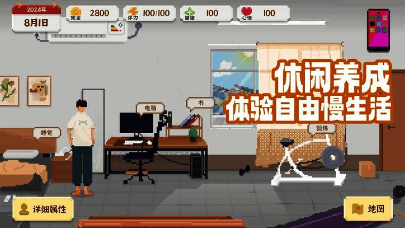 玩家需处理日常杂务,应对工作压力与生活挑战。游戏以像素风格高度还原现实细节,玩家可通过完成任务、工作获稳定收入,也能尝试投资创业等高风险高回报方式。游戏场景丰富,可自由探索。