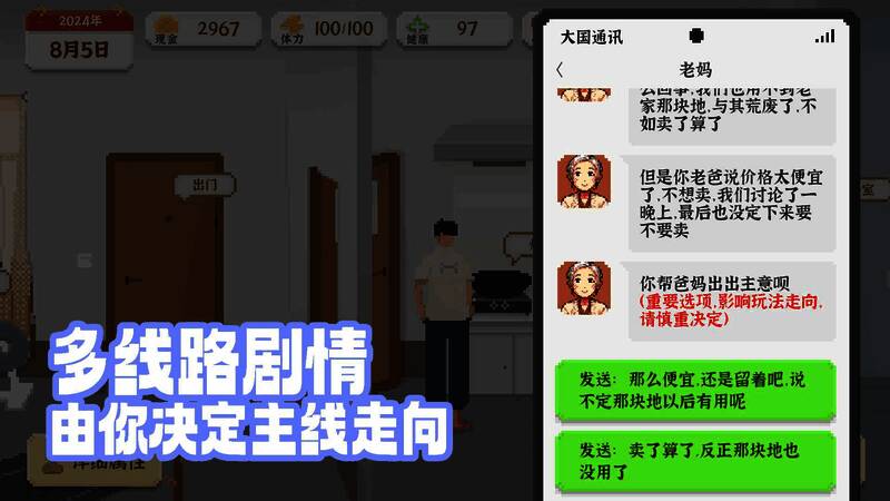 进入游戏开启新旅程,经过一段剧情后,开启主线任务——回老家祖宅。根据任务提示出门,在地图上找到祖宅位置前往,此过程会消耗体力。之后会遇到一位小姐姐,开启个人感情线。改造旧宅、开垦农田都需要消耗体力。可点击右上角手机,打开外卖软件点外卖恢复体力,每天限点一次。有体力后播种农作物并每日维护。无事可做时回家睡觉可恢复满体力,开启下一回合。