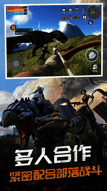 游戏提供单人故事模式与多人竞技模式切换,前者推动主线剧情解锁岛屿秘密,后者则开启PVP/PVE对抗,争夺恐龙领地。玩家还可通过建造木屋至钢铁堡垒,逐步强化基地防御。此外,随机刷新的火山喷发、陨石坠落事件以及神秘商人的出现,也为探险增添了更多变数。