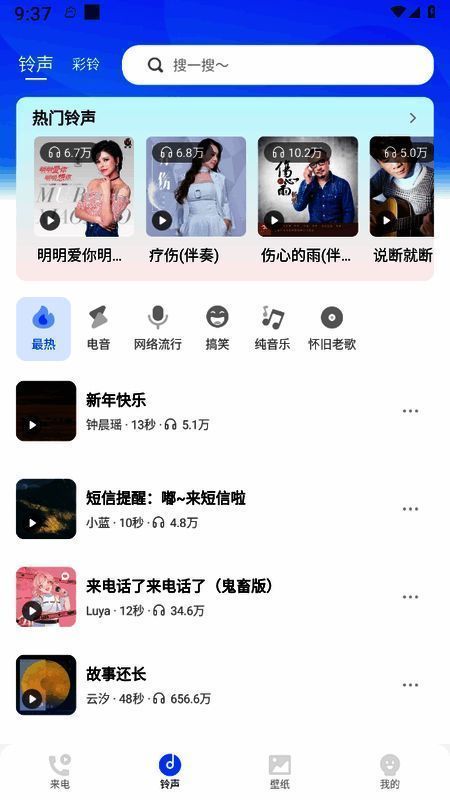 从流行音乐、影视金曲到动漫神曲、游戏音效,软件内置丰富多样的来电铃声类型,并设有实时更新的热门榜单,帮助用户快速发现当下最受欢迎的声音风格。无论是想为重要联系人定制专属铃声,还是追求每日新鲜感,这里都能一站式满足。