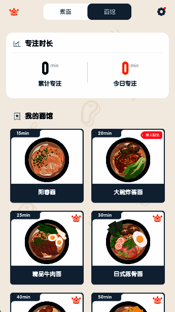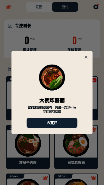 应用内设有丰富的面食种类,每一种面都对应不同的专注时长。例如,完成较短时间的任务可获得清汤面,而持续专注更久则能解锁拉面、田螺面甚至豪华牛肉面。这些“成果”不仅能在“我的面馆”中查看和积累,还能分享给好友,形成正向激励的社交反馈。每一次成功完成任务,都是对自己专注力的一次肯定,也让自律变得有趣而可衡量。