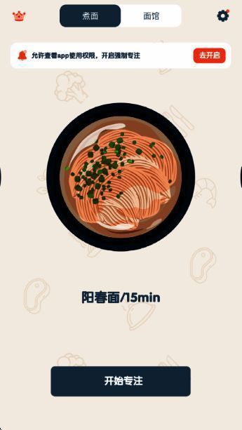 在信息爆炸的时代,手机成瘾已成为影响学习与工作效率的普遍问题。而《专注面馆官方版》作为一款创意十足的时间管理工具,巧妙地将“煮一碗面”的仪式感融入专注力训练中,让时间可视化、目标具象化。通过设定专注时长来“烹饪”不同种类的面食——如清汤面、拉面、热干面、牛肉面等,玩家在完成任务的同时,仿佛也在亲手制作一份精神食粮,既治愈又充满成就感。