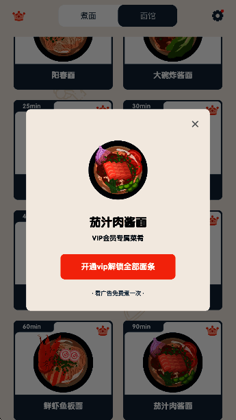 首次使用时,用户只需下载并打开App,即可进入主界面的“煮面模式”。选择想要专注的时间段后点击“开始专注”,屏幕将全屏显示煮面动画。值得注意的是,在开始后的前10秒内可以随时取消,之后若中途退出则视为失败,无法获得对应面条成果。在“面馆”页面中,用户可查看历史专注数据、累计时长及已解锁的面食类型。除前两种基础面外,其余面条需成为会员或通过观看广告临时解锁,为非付费用户也保留了体验空间。