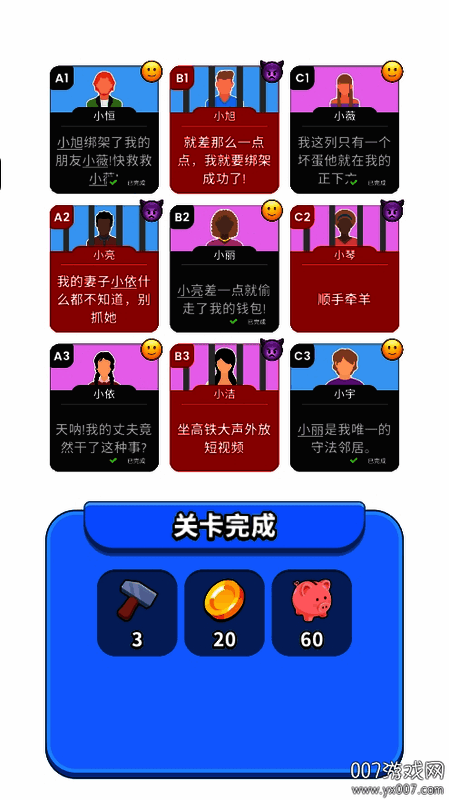 每个关卡都设有独特的背景故事与线索设定,玩家需要依靠敏锐的洞察力和缜密的逻辑推理,将碎片化的信息串联起来,揭开真相。从父母之间的秘密到爱情中的背叛,每一个短篇故事都蕴含着悬念与情感张力,让玩家在寻找罪犯的同时,也深入探索人物之间错综复杂的关系网络。