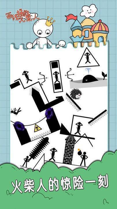 1、各关卡中绘制线条,助火柴人避开或通过危险。