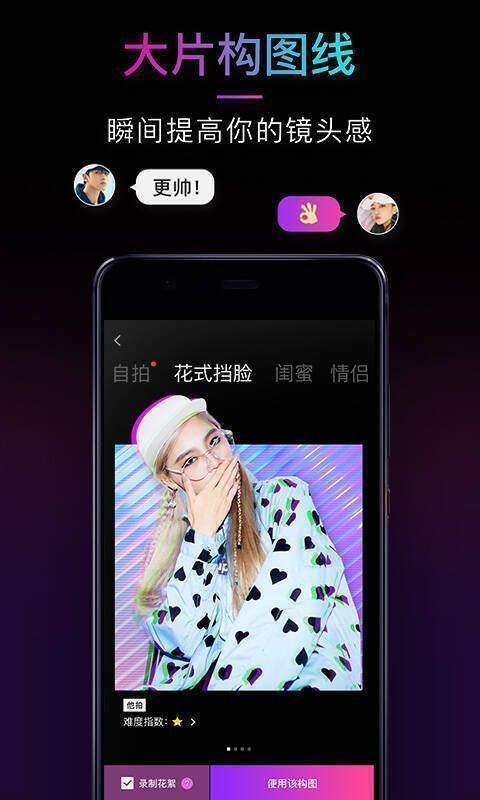 21 app由型男相机出品,是一款带有构图线的相机软件。它主打炫酷风格,内置众多时尚、潮流的滤镜供你选择,还有各类美颜效果,能让你的照片瞬间变身时尚大片!