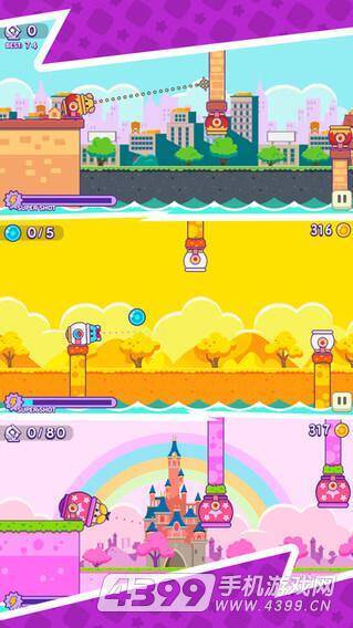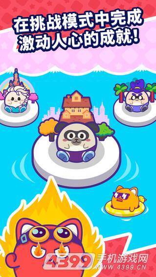 游戏界面色彩鲜艳,每个关卡都有不同任务,完成任务即可过关。关卡中需要宠物和大炮配合,宠物用于弹射,款式不同但技能差异不大,大炮则能辅助弹射。界面由许多不同大炮组成,玩家把宠物弹射进大炮就行,首个关卡要求弹射5个大炮,后续关卡会逐渐增加。