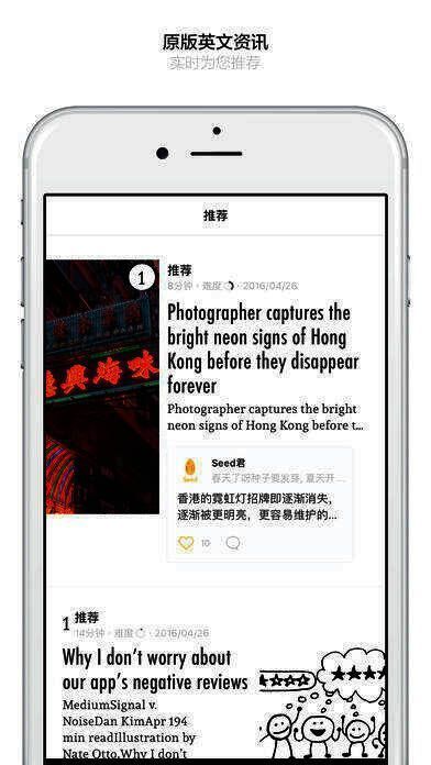 1、推荐:同步精选外媒的一手内容,涵盖当下热点资讯、流行趋势和深度观点。借助Seed君与社区用户的热度推荐,从海量内容中发掘最值得一读的英语资讯。