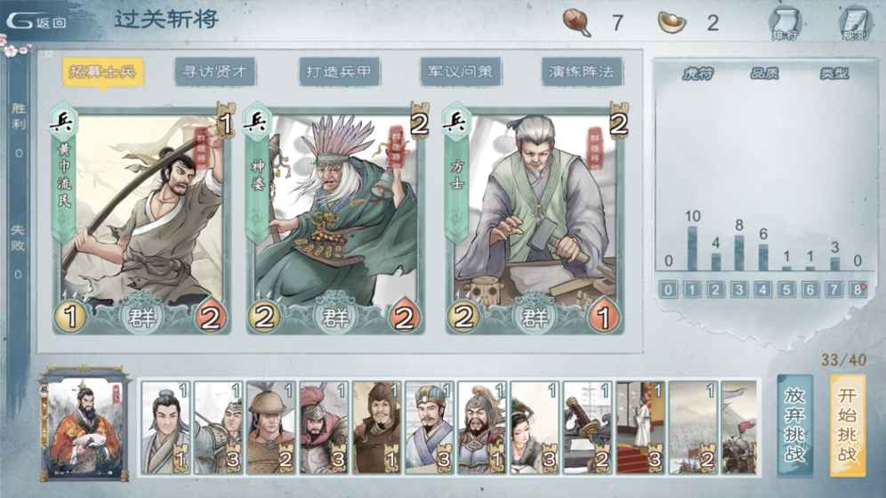 2、从你的卡库中选取属于该君主的兵(士兵)、将(将领)、计(兵法)、阵(阵法)、器(装备)这五种卡牌,构筑一套用于战斗的套牌。套牌的总卡牌数上限不固定,玩家可根据自身需求在30 - 40张之间调整。
