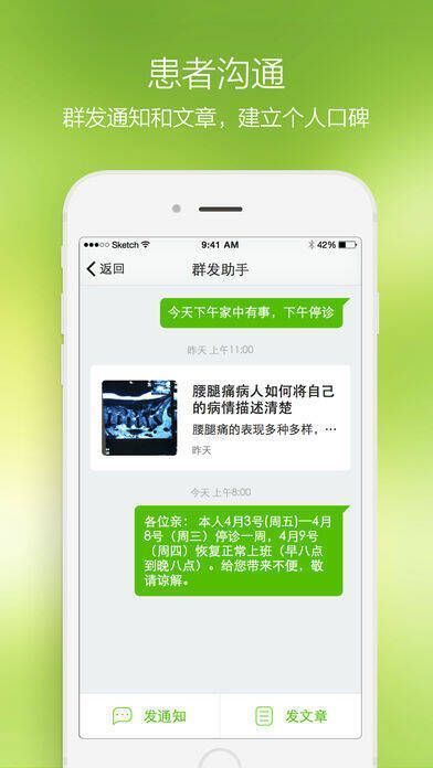 4、能和患者便捷沟通,可群发通知和文章,树立个人口碑。