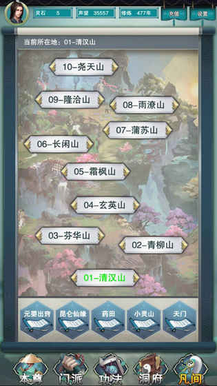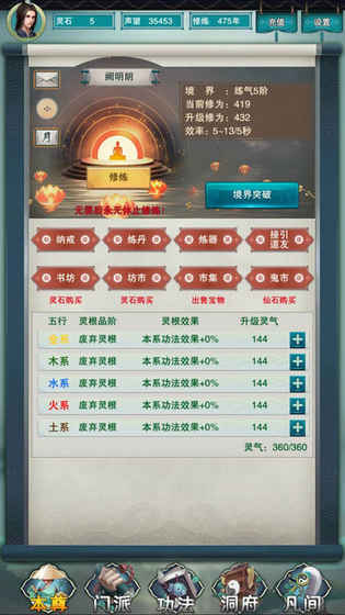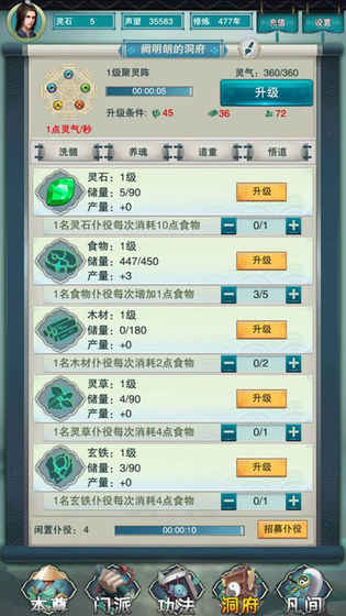 4、灵根洞府:可自由进行挖矿、采药、伐木等养成活动。