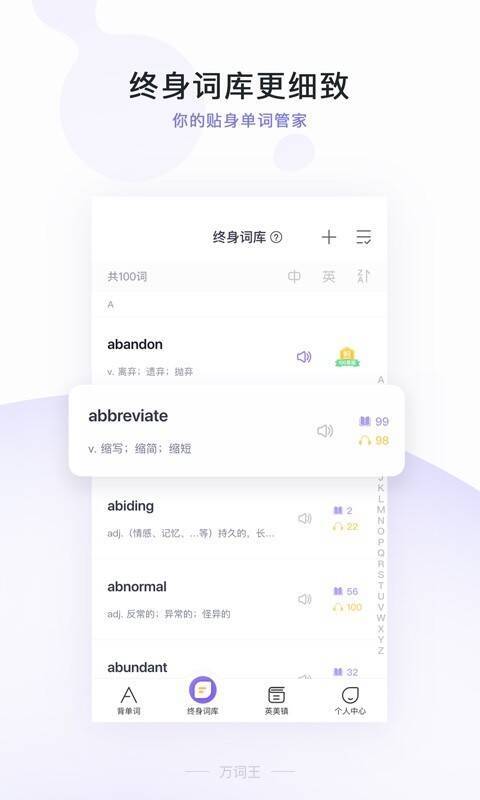 《完美万词王》通过间隔记忆个性单词,为用户制定计划、智能安排。欧美外教带你学词,语境剧场开启,记词方法多样有趣。