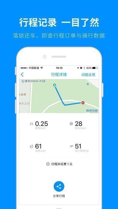 4、随时随地轻松还车:无固定车桩,停在任意公共停车区域即可完成还车。