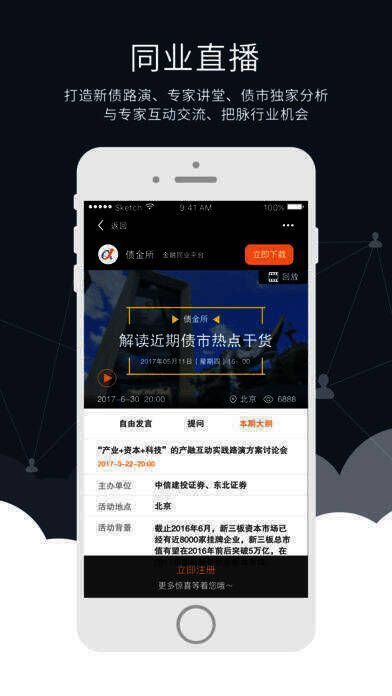 《债金所》是一款专门为金融从业者打造的社交平台。如果您从事金融工作,一定不要错过《债金所》,这里汇聚了众多志同道合的伙伴。大量金融行业精英都已入驻,您可以来这里交流取经。