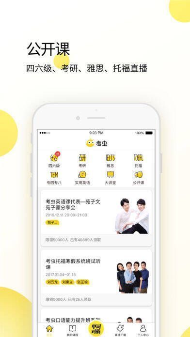 考虫英语是专业的英语在线直播学习产品,聚焦大学四六级、考研英语、雅思考试课程。它提供完整的学习配套资料、在线模拟考试、随堂测试、能力评估报告和课后答疑等考试学习解决方案,用户已遍布全国1800多所大学。