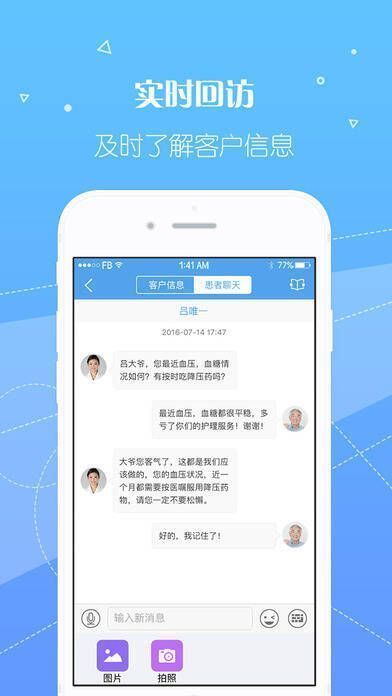 1、专家团队实时在线,方便医护与客户沟通;2、医护预约和就诊支付轻松搞定;3、诊疗护理和健康档案随时掌握;4、使用软件让健康更简单快乐。