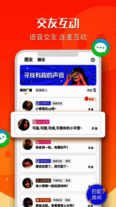 《多玩语音》一款专注于开黑语音的娱乐平台,该软件提供了王者,吃鸡和各种游戏,声音开黑,24小时语音聊天室,各种技巧和凉爽的锻炼,让你体验,你最喜欢的声音在这里,有趣的灵魂,高品质的声音,派对的圣地,吃鸡等游戏玩家的首选,那还等什么呢,感兴趣的下载体验吧。