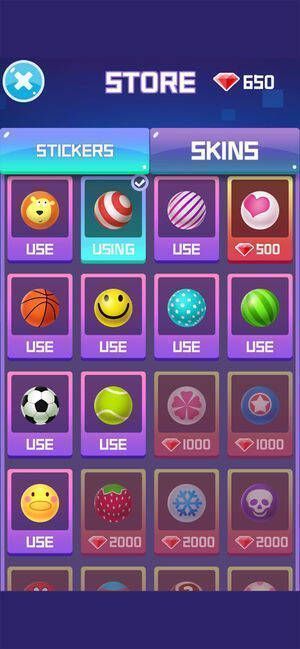 说这个游戏佛系一点不为过,每个关卡都不会卡关,只要砸掉所有像素方块即可,且无时间限制。每隔 5 关钻石会自动到手,钻石可直接兑换皮肤贴纸,想要哪个换哪个,所需钻石数量相同,十分贴心。