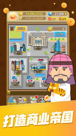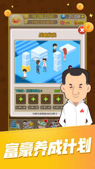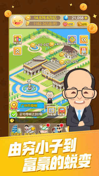 这是一款放置类挂机手游,玩家化身为新人创业者,要探寻赚取人生第一桶金的方法。可以通过工作、学习来攀登职业阶梯,还能在交易所或赌场赢钱,实现买车、买房、买飞机等梦想,甚至能竞选总统,体验完整的人生历程,尽情享受赚钱带来的成就感。