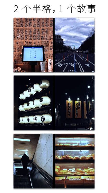 多数复古相机应用仅模拟胶片滤镜,而Halframe更进一步,模拟出「半格相机」自动拼贴效果。半格相机将画幅缩减一半,一卷36张的胶片可拍72幅照片,自带拼图效果。半格相机如同双刃剑,拼贴能带来更多画面信息与前后呼应效果,但画幅受限且无法后期调节,在没有拼图应用时是亮点,如今看来有些鸡肋。