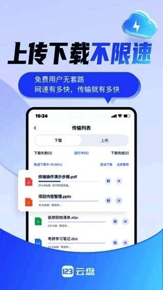 123云盘app是由西安一二三云计算有限公司打造的一款免费、不限速且无广告的网盘应用。和其他网盘相比,其显著优势在于,即便使用免费版,用户也能享受满速的上传与下载体验,彻底摆脱国产网盘常见的限速困扰。该软件操作便捷,支持多人资料共享,一人上传的资料多人可阅读,无需重复操作,极大提升了团队协作效率。