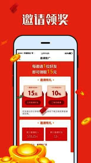 邀请一位朋友使用赚钱帮手应用程序,可获得15元现金奖励。