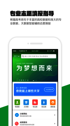 《熊猫高考》是一款助力考生填报高考志愿的实用软件。它与众多高校展开在线合作,秉持智能便捷、高效专业、值得信赖的理念,为学生和家长提供专业的高考志愿咨询服务,助力考生以相同分数报考更好院校。