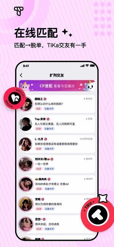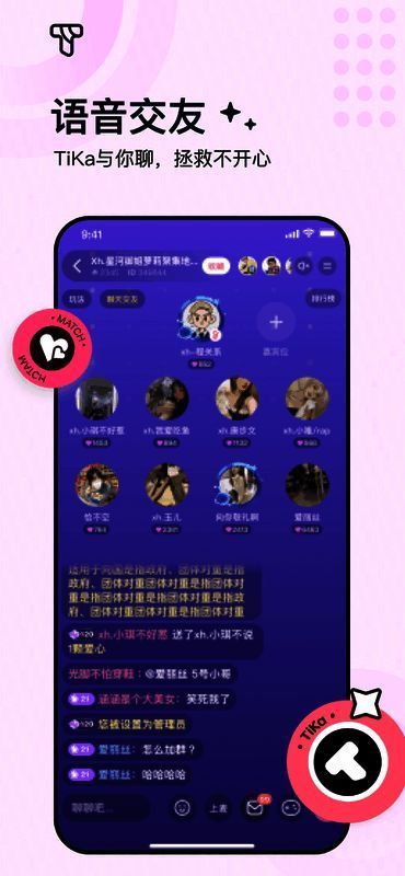 TiKa语音app是一款助力你成功脱单的语音交友应用。无需害羞担忧,它能满足多样交友需求。社恐用户可选择文字聊天,也能通过摇一摇随机匹配,与感兴趣的人畅快交流。软件内还有诸多小游戏,让交流更顺畅。