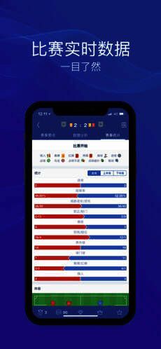 2、全球赛事即时足球比分,具备齐全的足球比赛事件与实时数据统计;