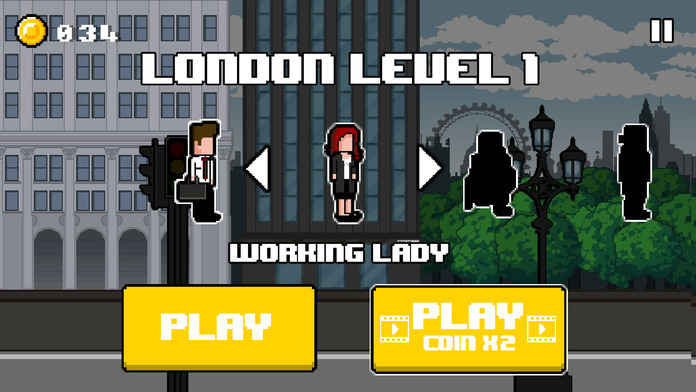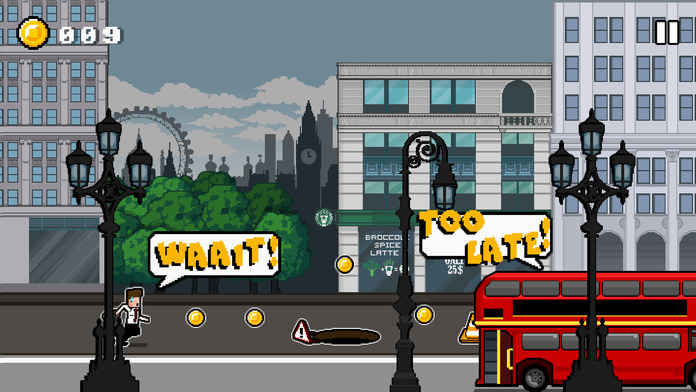 《赶公交》(Catch the Bus)的画面采用2D横版屏幕展示,漫画式的画面风格令人眼前一亮,特别是对背景的描绘独具特色,从背景的一些建筑能看出,这款游戏应该是以伦敦为原型制作的。此外,游戏中的人物造型也颇具特点,他们的面部表情都是空白的,就像平常面无表情的上班族。