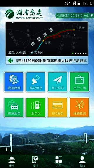 该 app 八大功能版块与司乘人员密切相关,还有丰富实用的信息,让司乘人员掌握湖南高速资讯。