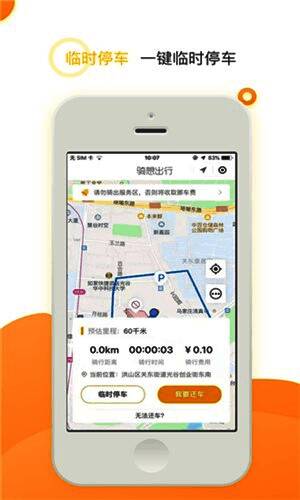 3、只需打开手机扫码,即可迅速用车,还具备一键临时停车功能。
