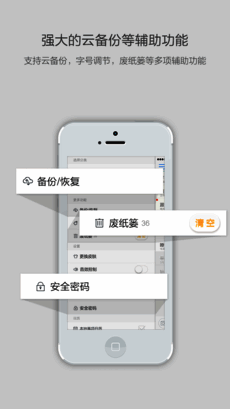 1、提供文字、语音、录音转文字、拍照、手写、涂鸦、富文本、粘贴、选图等全方位的记事模式;2、可对文件分类进行管理,包括新建、更名、排序;3、能为事项设置提醒,支持每日、周、自定义频率,还能自选声音;4、语音文字转化功能,让记事如同说话般轻松;5、支持拖放记事并添加到日历,轻松规划日程;6、拥有可开关音效、更换皮肤的优质 UI;7、可将笔记备份到云端,保障数据安全;8、具备废纸篓、密码锁、本地备份等安全措施。