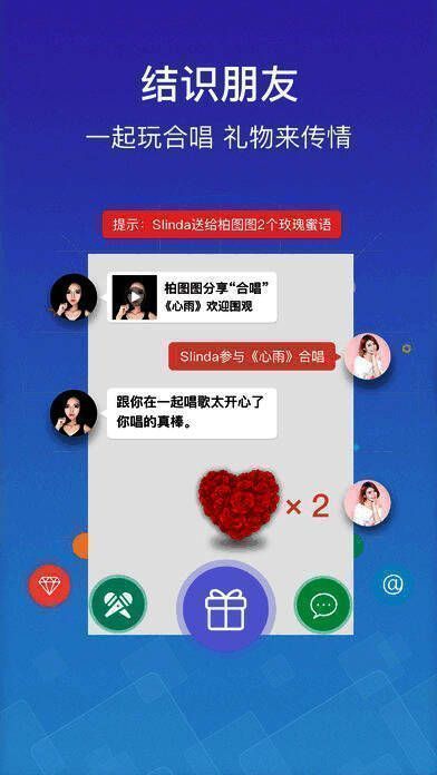 众多人气歌手明星、网络红人强势入驻,让您可以与他们零距离对话交流;通过好友合唱、歌曲交流、聊天互动等方式,结识更多志同道合的朋友,因歌结缘就是如此简单;还能一键将自己的动人歌声分享至微信、QQ好友、朋友圈、QQ空间、新浪/腾讯微博等社交平台。