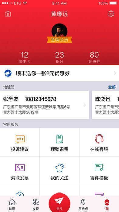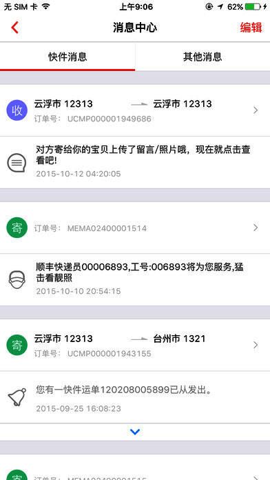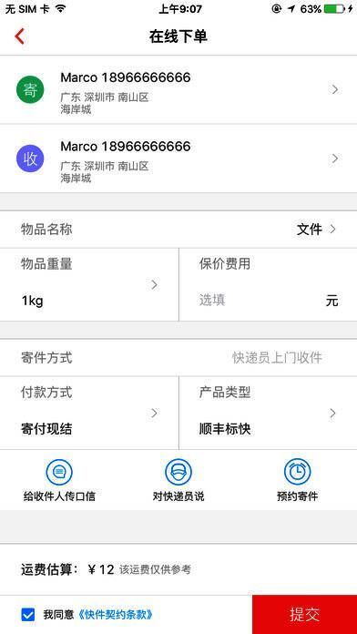 - 我要寄件:填写订单寄件,可设置默认寄件人,将未完成订单保存到草稿箱。寄件时可进行运费、收送范围、禁寄品查询,自动定位寄件人位置,从手机通讯录或顺丰地址簿选择收寄件人信息,还能添加或删除多个收件人。